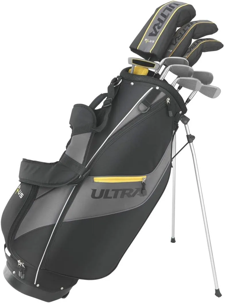 The WILSON Ultra plus comes with ten clubs. The set includes a driver, fairway wood, hybrid, 6 to 9 irons, a pitching wedge, a sand wedge, and a putter. The package also has three head covers and a stand bag.